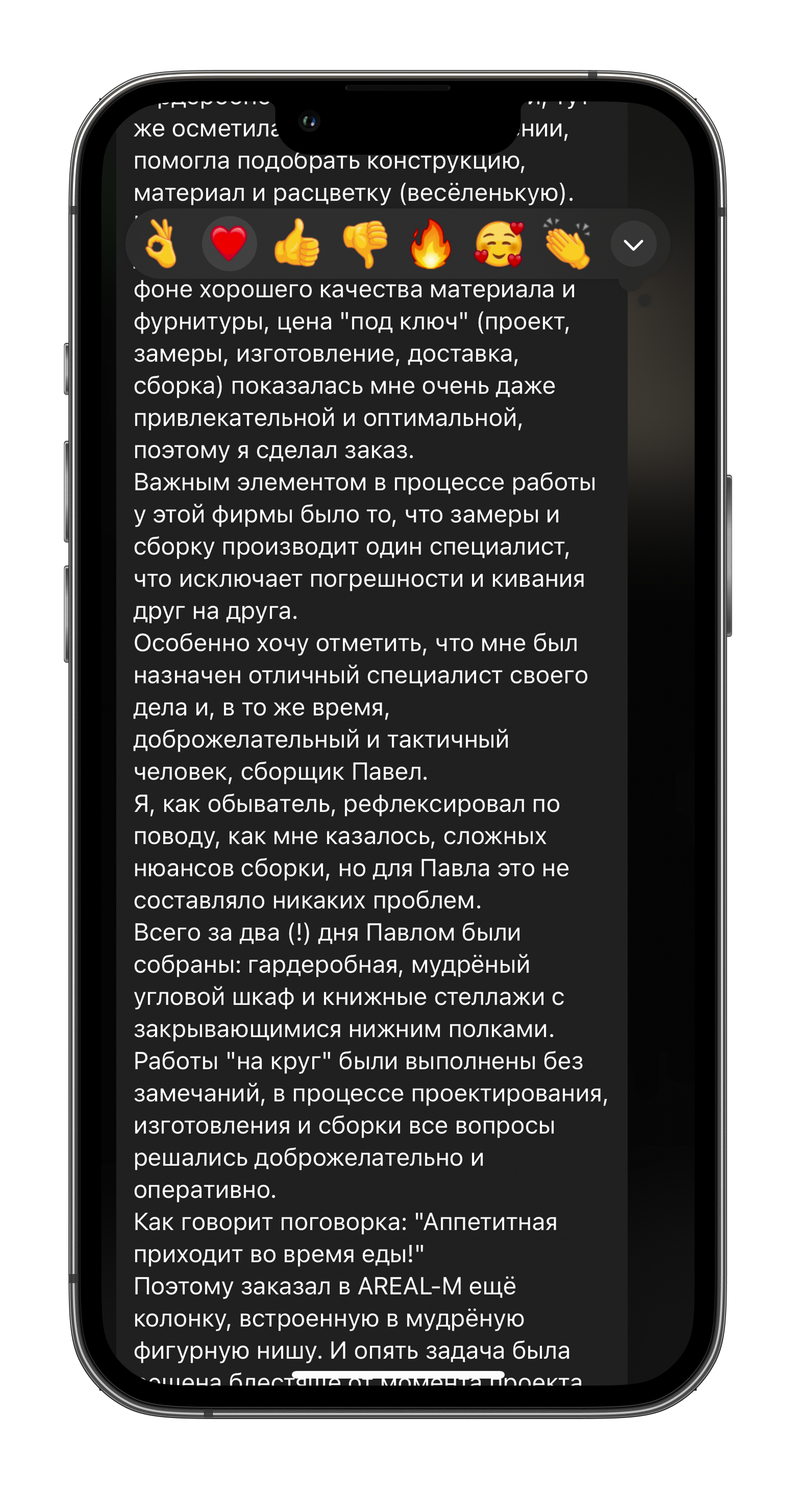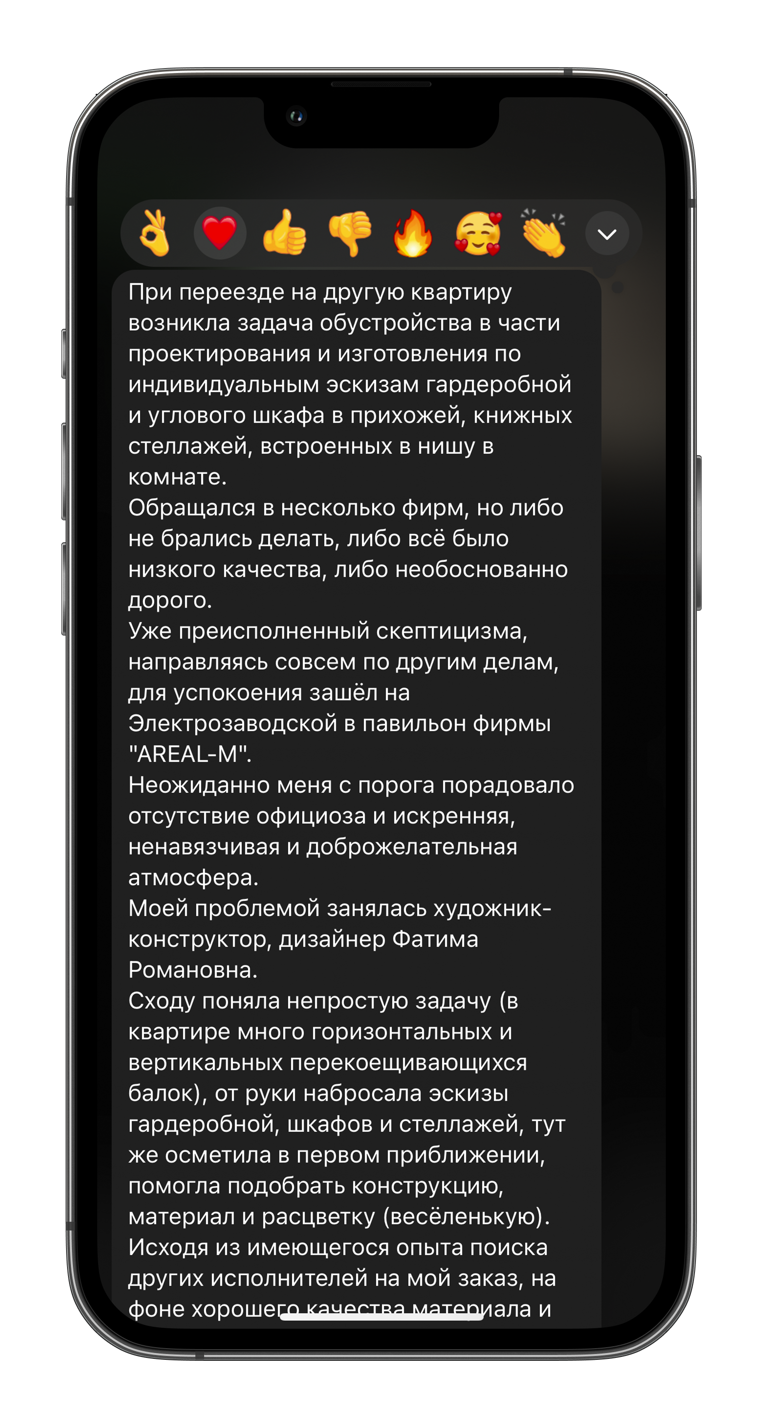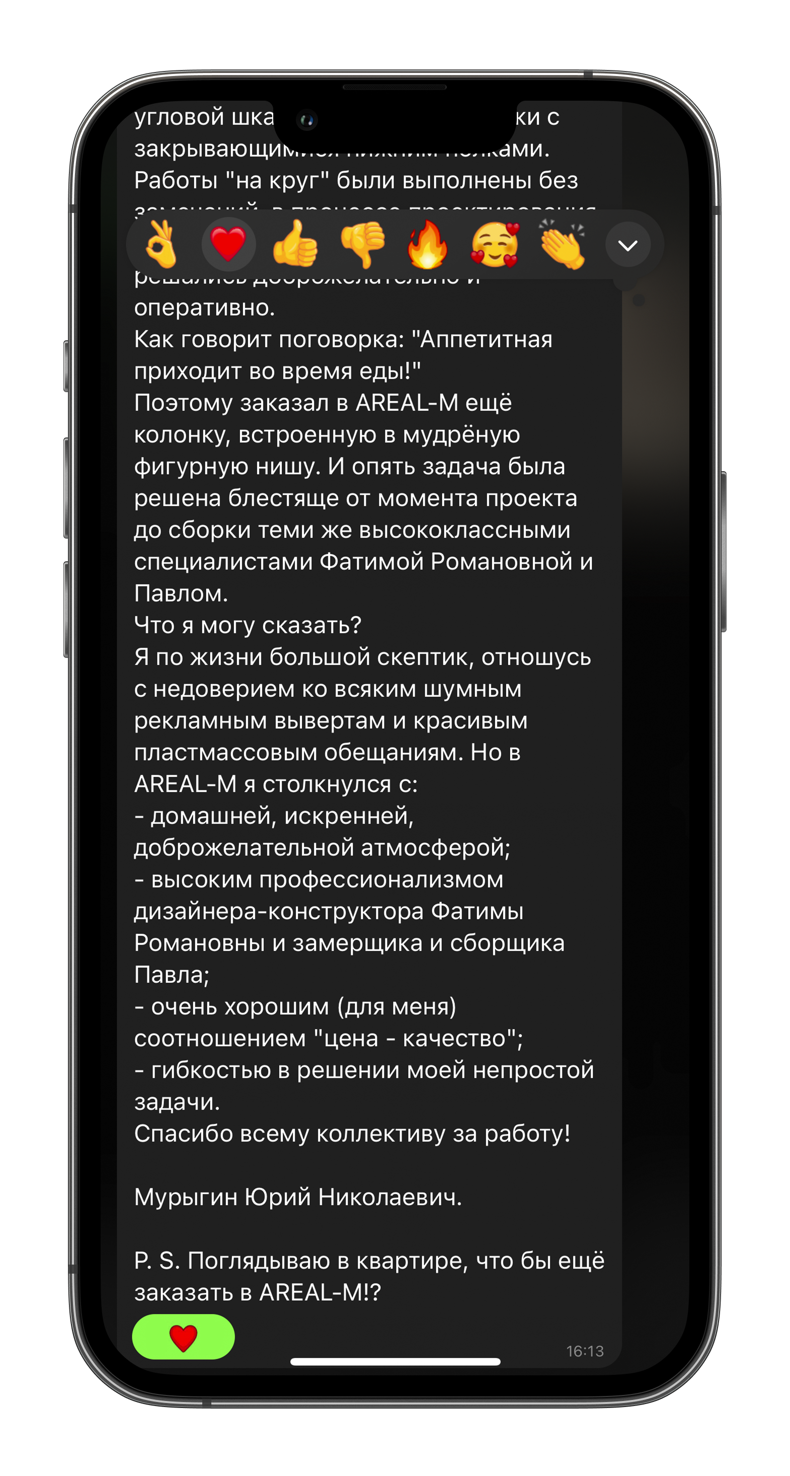 Уже не впервые заказываем мебель у компании AREAL-M. И очень довольны, что одна-жды мы обратились именно в эту компанию. Вся наша ме-бель служит уже не первый год. Вот захотелось оста-вить слова благодарности. Особенно Фатиме, с которой тесно работали. Качество мебели на высшем уровне, сервис тоже. А общение со-трудников компании не только на профессиональном уровне, а ещё оставляет теплые, добрые эмоции. Спасибо AREAL-M что вы есть!